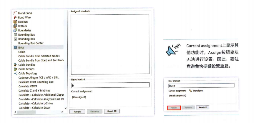 更快调出常用功能的第二个方式是登记快捷键。选择路径里的Customize Shortcut,弹出如下的窗口。从左侧选择常用功能后,按下要指定的快捷键,就会出现在右侧窗口。指定的快捷键已经设置有其他功能的,在Current assignment区域会显示具体功能,没有设置其他功能的会显示为Unassigned。