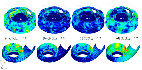 当涉及到1.7工况的大量漩涡分布时,漩涡的强度非常集中。为了降低涡舌区域漩涡的强度,可以使用更大的蜗壳进行匹配。Powerflow中的Power Acoustics是一款强大的噪声后处理工具,可以针对频谱中的带通滤波器噪声源强度进行处理。它可以计算出带通滤波器噪声源在叶轮和蜗壳上的能量分布。