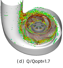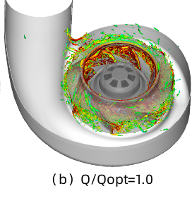 另外,Powerflow基于VLES算法还可以准确显示三维瞬态漩涡的分布,对于流量1.0工况的旋涡主要分布在叶片前缘和导风圈间隙回流位置,工程设计可以更改前缘叶片角度来降低漩涡强度。