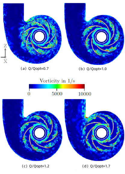 如图所示,在不同流量下风机截面涡量分布存在着差异,着将会决定风机噪声的大小。我们可以清晰地了解到,小流量0.7工况叶片流道内气流分离较强,而流量1.0和较大流量1.2下叶片尾缘漩涡分布较强。这说明了,想要抑制大流量的噪声,需要在进口和涡舌上给予更优的设置。