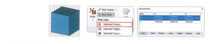 Selected Points:确认Pick Point List的窗口: 可以进行删除或移动各Points的操作。按下ctrl键选中两个Point,可以实现取这两个Point的中点(Mean)、从这两个Point生成一条线(To Edge)的功能。