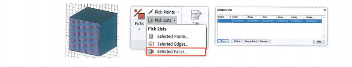 Modeling > Picks > Pick Lists > Selected Points / Edges / Faces