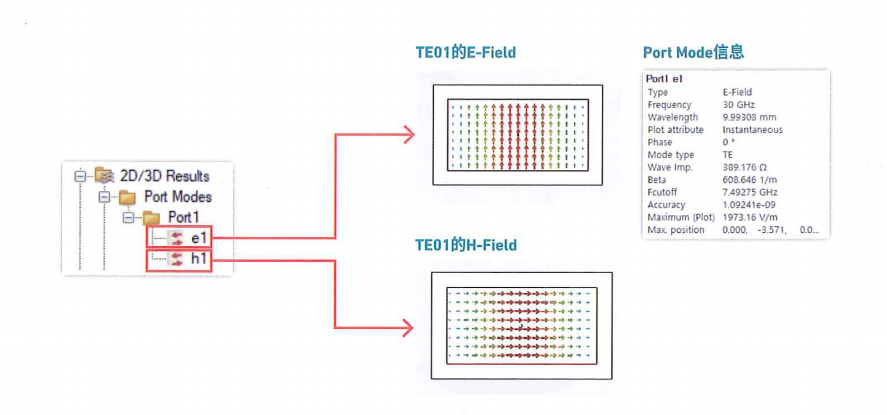 将Source接通到Waveguide Port时,可以在2D/3D Results中确认端口模式(Port Modes)如果设置了多个端口,可以分别确认各端口的模式。可以查看每个端口的电场和磁场模式,确认端口阻抗、波长、模式类型等信息。完成仿真分析后,可以确认关注的频点上阻抗和端口形成的Mode Type是否良好。