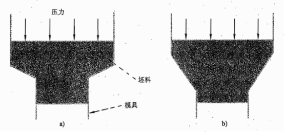 a)模具形状不合理,坯料无法向下流动b)修改模具形状后,坯料可以向下流动