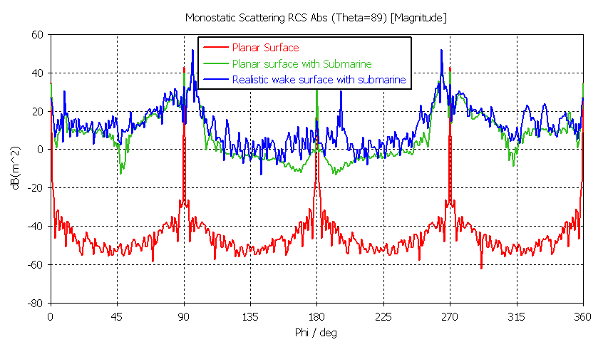 图5:平面(红色)、带有潜艇的平面(绿色)和带有潜艇的真实尾流(蓝色)的矩形RCS图