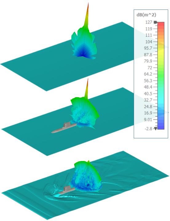 隐蔽性和可探测性是潜艇设计的关键。潜艇在水面的雷达截面(RCS)不仅取决于船只的几何形状,还取决于水面上的流体动力学尾流。仿真软件可用于分析运动中的半潜式潜艇的RCS,并优化几何形状以最小化尾流的RCS。统一的建模和仿真方法(简称:MODSIM)允许仿真结果为设计提供信息,缩短开发过程,以生产出满足隐蔽要求的潜艇,而不会影响其他目标。
