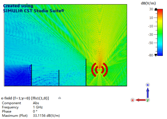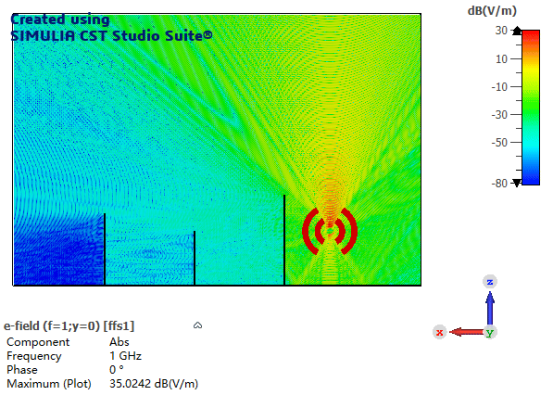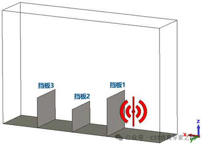 下面我们来看一个简单的例子。模型由一个地板和3个PEC挡板组成,用CST的宏命令Analytical Farfiled Source可以快速的生成一个全向的远场源,放置在挡板1的右侧。