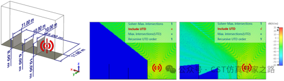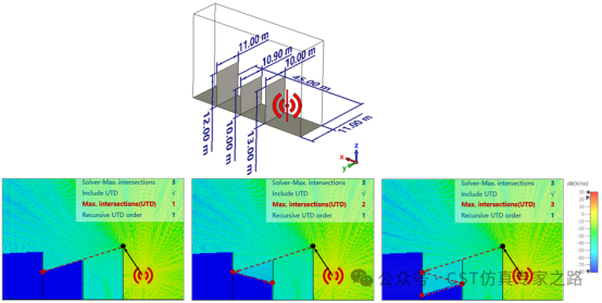 顾名思义,该复选框用来设置是否启用UTD,即控制“发生”或者“不发生”衍射,此处的衍射由UTD贡献。如下图的例子,挡板1、2、3的厚度为0m,长度和高度也各不相同,方便我们研究射线的行为。在这个例子中,Max.intersections(UTD)被禁用,所以求解器会使用主对话框中的设置,即Solver-Max. intersections=1,代表射线在经过一阶衍射之后,只能与物体有1个交点(所以不存在射线的反射和透射),可以从下(右)图中挡板2和挡板3之间的电场分布观察到这点。并且因为不存在反射和透射,所以挡板1和挡板2之间的靠近地板的电场全由一阶衍射提供。