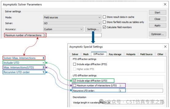 只有勾选了Include edge diffraction(UTD)后,才可以设置Maximum number of intersections(UTD),即射线与物体的最大交点数(反射或透射)。这里的设置项N,表示射线在发生一阶衍射之后,还能与物体发生N次反射或透射。这里的N只能小于等于A求解器主界面中的“最大交点数”,如果这个选项被禁用了,则使用主界面的设置。