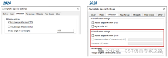 CST的A-solver是一款基于高频近似算法的求解器,具有计算时间短、内存消耗低、计算效率高等优势,通常用于求解超电大尺寸问题。然而,由于算法本身并非全波算法,在处理衍射现象时存在一定的近似误差。为了弥补这一点,A-solver在Special Settings中引入了PTD(Physical Theory of Diffractio,物理衍射理论),并且从CST 2024版本开始,进一步增加了UTD(Uniform Theory of Diffraction,统一衍射理论)作为对PTD的有力补充,两者结合后,能够更准确地模拟复杂的衍射现象,提供更加真实的求解结果。