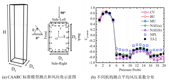 式中Cpstd和Cpmean为测点平均风压和脉动风压系数;Pmean和Pstd为建筑表面测点平均风压和脉动风压;P0为自由来流方向参考高度H处静压;为空气密度;UH为自由来流方向参考高度H位置风速。