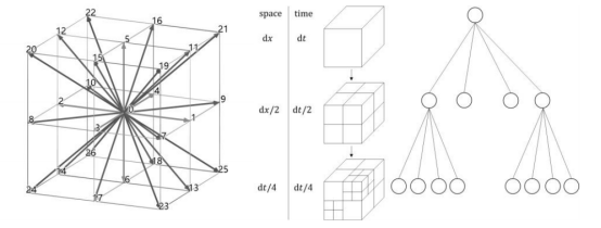 LBM方法采用八叉树结构的晶格类网格进行计算域流场离散划分,针对设定好的最粗网格尺寸与贴体最细网格尺寸,采用自适应方式进行整体计算域多层级网格和时间步长设定,具体如图1(b)所示。LBM多尺度格子自适应加密技术能够适应建筑工程领域不同计算对象的复杂几何特点,计算时能保证数值计算稳定性和高效的并行计算效率。