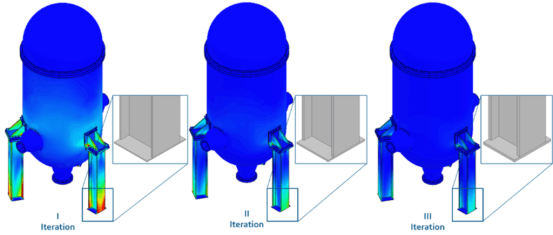 反应堆的三个设计迭代。仿真结果揭示了支撑结构中的应力点,并显示了微小的设计参数更改如何改变结果并降低总体应力。