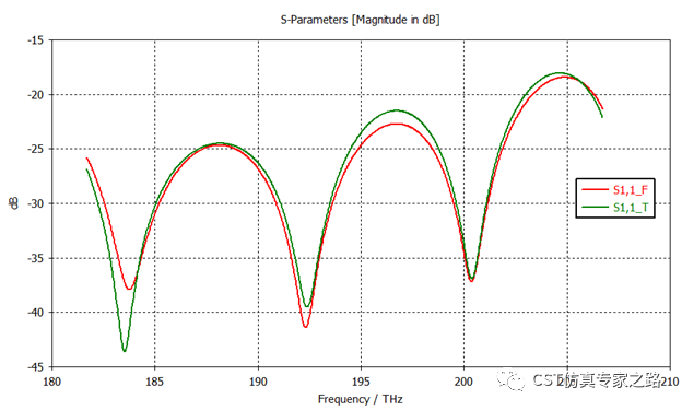 接下来就可以仿真了。其实T和F都可以,因为还没加微谐振腔。要想二者结果匹配的好,提高精度,加密网格,材料统一,尤其是非均匀的波导的端口模式和色散,都是关键。这里跳过设置细节,直接上结果,可以看到两个算法不同网格都能在THz拿到非常一致的结果。(当然想要再精确也可以,只要有时间继续等喽;谁再不相信CST时域谐振点算不准,出来挨打)