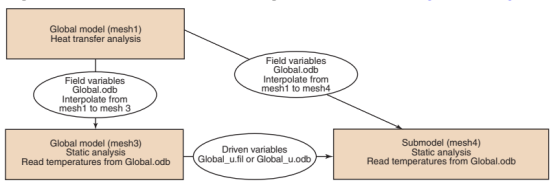 运行全局模型的热传递分析,并将节点温度写入结果或输出数据库文件。运行全局模型的顺序耦合热应力分析。在这种情况下,从全局热传递分析的结果或输出数据库文件中获得的温度是场变量。如果热应力分析中使用的网格与热传递分析中使用的网格不同,则指定Abaqus/Standard将热传递分析网格中的温度场插值到热应力分析网格中。运行子模型的热应力分析,使用全局热应力分析的结果或输出数据库文件读取驱动变量(位移场),并使用全局热传递分析或全局热应力分析的结果或输出数据库文件读取温度作为场变量。在任何一种情况下,温度场都必须插值到当前子模型节点。如果不同网格之间的插值是必要的,全局输出数据库文件必须用于读取温度。详细内容见图13和图14。