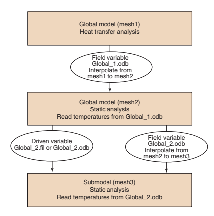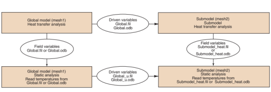 l运行全局模型的热传递分析,并将节点温度写入结果或输出数据库文件。使用与全局热传递分析相同的网格(mesh1)和来自全局热传递分析结果或输出数据库文件的温度运行顺序合热应力分析(全局热应力分析)。接下来,使用最终子模型热应力分析所需的网格(mesh2) 运行子模型热传递分析,并将节点温度写入结果或输出数据库文件。 使用全局热传递分析的温度解来驱动子模型热传递分析的解。最后,使用从子模型传热分析的结果或输出数据库文件中获得的温度(作为场变量)和从全局热应力分析中获得的位移(作为驱动变量)运行子模型热应力分析。见图15中的详细流程图。