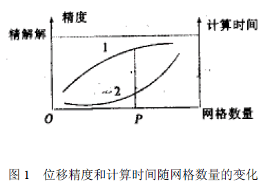 网格数量的多少将影响计算结果的精度和计算规模的大小。一般来讲,网格数量增加,计算精度会有所提高,但同时计算规模也会增加,所以在确定网格数量时应权衡两个因数综合考虑。 图1中的曲线1表示结构中的位移随网格数量收敛的一般曲线,曲线2代表计算时间随网格数量的变化。可以看出,网格较少时增加网格数量可以使计算精度明显提高,而计算时间不会有大的增加。当网格数量增加到一定程度后,再继续增加网格时精度提高甚微,而计算时间却有大幅度增加。所以应注意增加网格的经济性。实际应用时可以比较两种网格划分的计算结果,如果两次计算结果相差较大,可以继续增加网格,相反则停止计算。