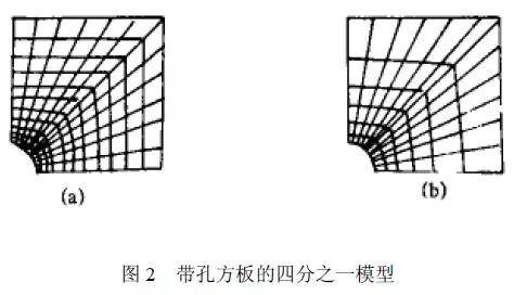 网格疏密是指在结构不同部位采用大小不同的网格,这是为了适应计算数据的分布特点。在计算数据变化梯度较大的部位(如应力集中处),为了较好地反映数据变化规律,需要采用比较密集的网格。而在计算数据变化梯度较小的部位,为减小模型规模,则应划分相对稀疏的网格。这样,整个结构便表现出疏密不同的网格划分形式。 图2是中心带圆孔方板的四分之一模型,其网格反映了疏密不同的划分原则。小圆孔附近存在应力集中,采用了比较密的网格。板的四周应力梯度较小,网格分得较稀。其中图b中网格疏密相差更大,它比图a中的网格少48个,但计算出的孔缘最大应力相差1%,而计算时间却减小了36%。由此可见,采用疏密不同的网格划分,既可以保持相当的计算精度,又可使网格数量减小。因此,网格数量应增加到结构的关键部位,在次要部位增加网格是不必要的,也是不经济的。