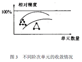 许多单元都具有线性、二次和三次等形式,其中二次和三次形式的单元称为高阶单元。选用高阶单元可提高计算精度,因为高阶单元的曲线或曲面边界能够更好地逼近结构的曲线和曲面边界,且高次插值函数可更高精度地逼近复杂场函数,所以当结构形状不规则、应力分布或变形很复杂时可以选用高阶单元。但高阶单元的节点数较多,在网格数量相同的情况下由高阶单元组成的模型规模要大得多,因此在使用时应权衡考虑计算精度和时间。 图3是一悬臂梁分别用线性和二次三角形单元离散时,其顶端位移随网格数量的收敛情况。可以看出,但网格数量较少时,两种单元的计算精度相差很大,这时采用低阶单元是不合适的。当网格数量较多时,两种单元的精度相差并不很大,这时采用高阶单元并不经济。例如在离散细节时,由于细节尺寸限制,要求细节附近的网格划分很密,这时采用线性单元更合适。