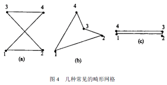 网格质量是指网格几何形状的合理性。质量好坏将影响计算精度。质量太差的网格甚至会中止计算。直观上看,网格各边或各个内角相差不大、网格面不过分扭曲、边节点位于边界等份点附近的网格质量较好。网格质量可用细长比、锥度比、内角、翘曲量、拉伸值、边节点位置偏差等指标度量。 划分网格时一般要求网格质量能达到某些指标要求。在重点研究的结构关键部位,应保证划分高质量网格,即使是个别质量很差的网格也会引起很大的局部误差。而在结构次要部位,网格质量可适当降低。当模型中存在质量很差的网格(称为畸形网格)时,计算过程将无法进行。图4是三种常见的畸形网格,其中a单元的节点交叉编号,b单元的内角大于180°,c单元的两对节点重合,网格面积为零。