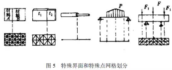 结构中的一些特殊界面和特殊点应分为网格边界或节点以便定义材料特性、物理特性、载荷和位移约束条件。即应使网格形式满足边界条件特点,而不应让边界条件来适应网格。常见的特殊界面和特殊点有材料分界面、几何尺寸突变面、分布载荷分界线(点)、集中载荷作用点和位移约束作用点等。图5是具有上述几种界面的结构及其网格划分形式。