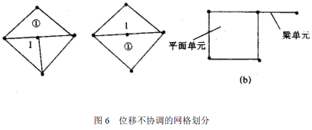 位移协调是指单元上的力和力矩能够通过节点传递相邻单元。为保证位移协调,一个单元的节点必须同时也是相邻单元的节点,而不应是内点或边界点。相邻单元的共有节点具有相同的自由度性质。否则,单元之间须用多点约束等式或约束单元进行约束处理。图6是两种位移不协调的网格划分,图a中的节点1仅属于一个单元,变形后会产生材料裂缝或重叠。图b中的平面单元和梁单元节点的自由度性质不同,粱单元的力矩无法传递到平面单元。
