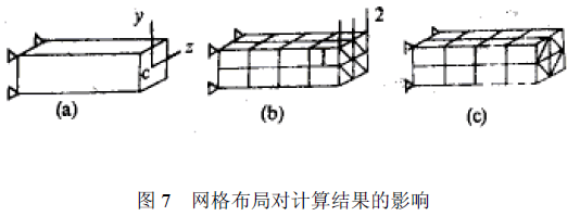 当结构形状对称时,其网格也应划分对称网格,以使模型表现出相应的对称特性(如集中质矩阵对称)。不对称布局会引起一定误差,如在图7中,悬臂粱截面相对y轴对称,在对称载荷作用下,自由端两对称节点1、2的挠度值本应相等。但若分图b所示的不对称网格,计算出的y1=0.0346,y2=0.0350。若改用图c所示的网格,则y1和y2完全相同。
