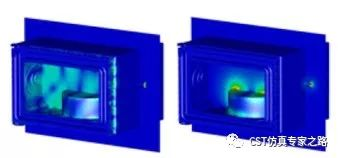 微波炉:微波炉的多物理场仿真(炉门网格未显示)—左侧:频率为2.45GHz的电场;右侧:30秒后的温度分布。