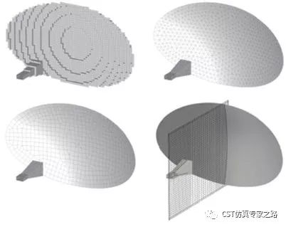 阶梯六面体(左上)、曲面四面体(右上)、曲面表面元(左下)以及CST软件的专有技术PBA(右下)。